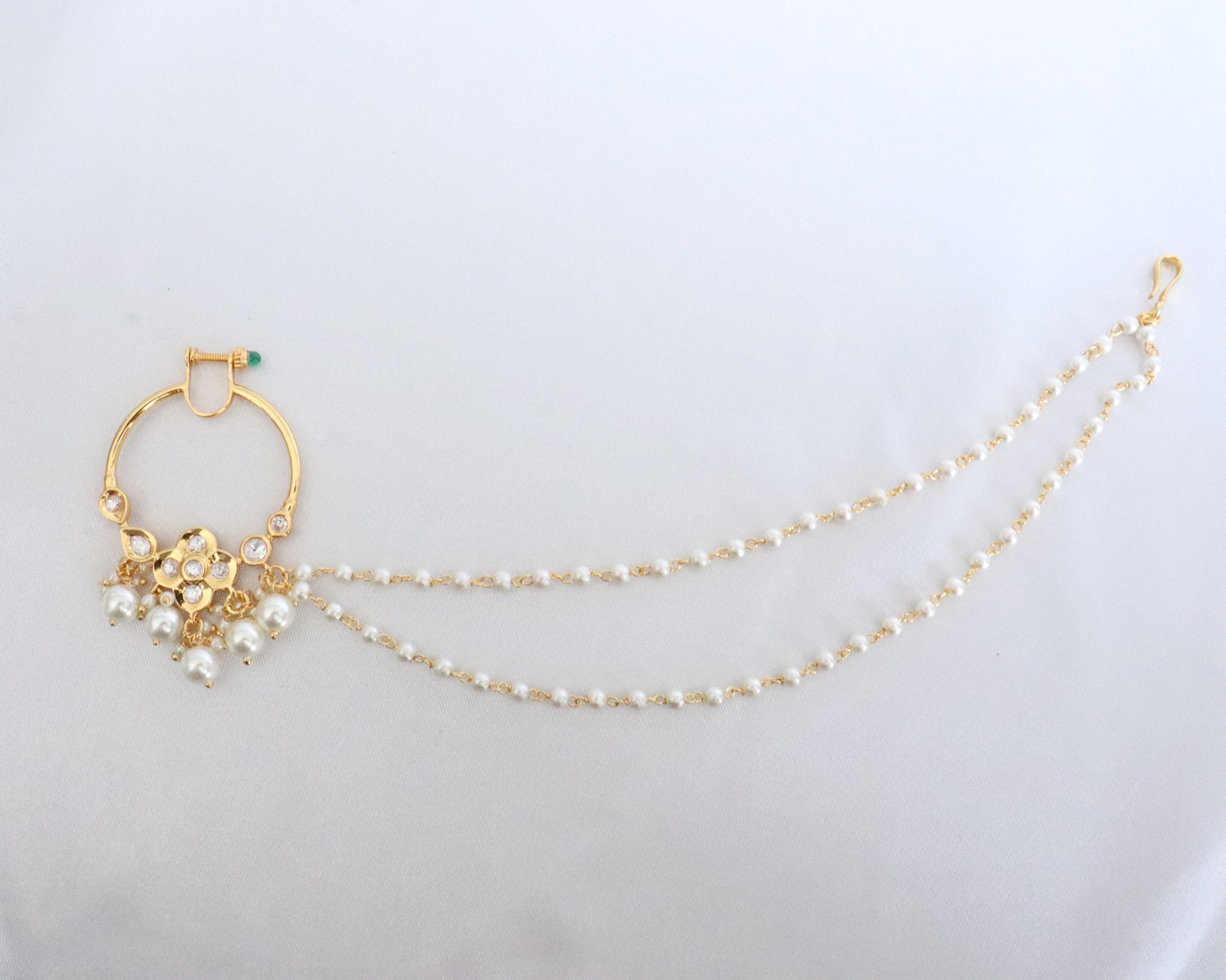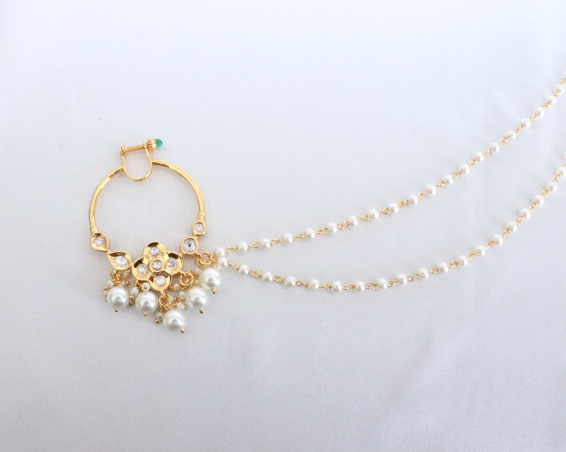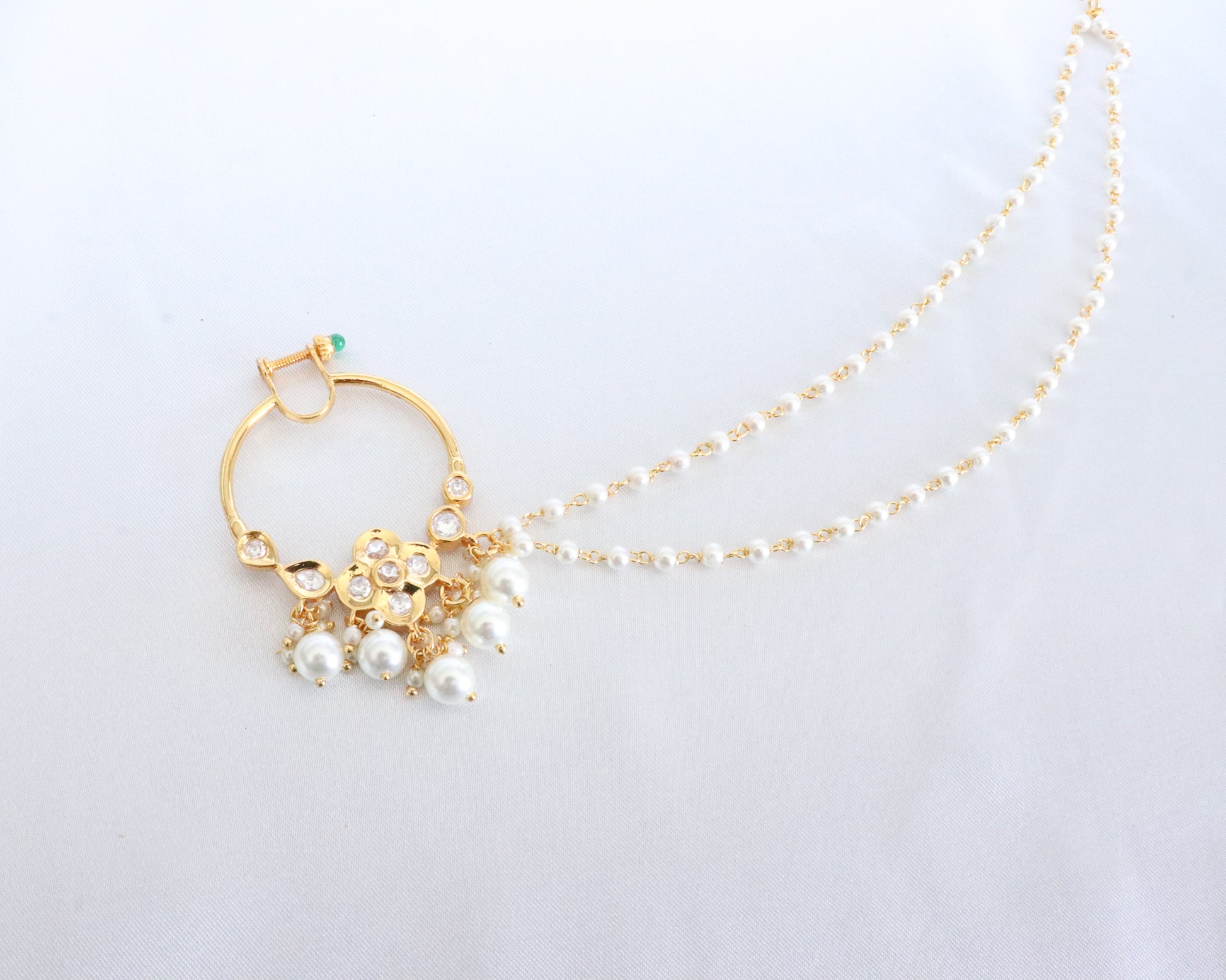 A small sized gorgeous nose ring with a floral design and 2 pearl chains that will add that "oomf" to your final look.