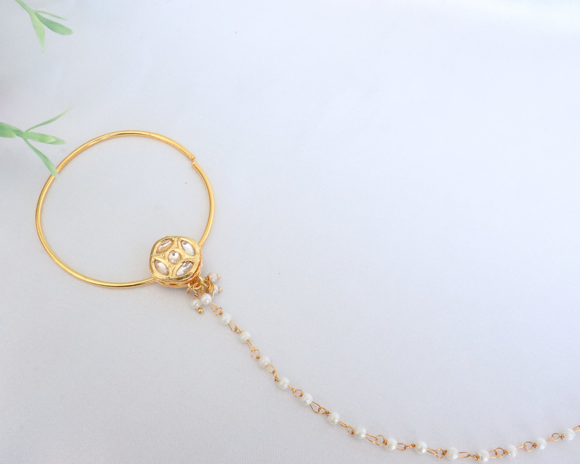 A simple large nose ring with a pearl chain. This nose ring is easy to wear for those that have or don't have a nose piercing.